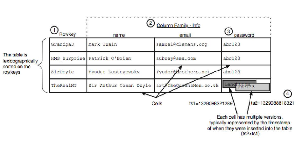 The name derives from the structure, composed of sparse columns and no schema. We don’t have to think of this structure as a table, but as a two-level map (map of maps). Columns put together form a family.