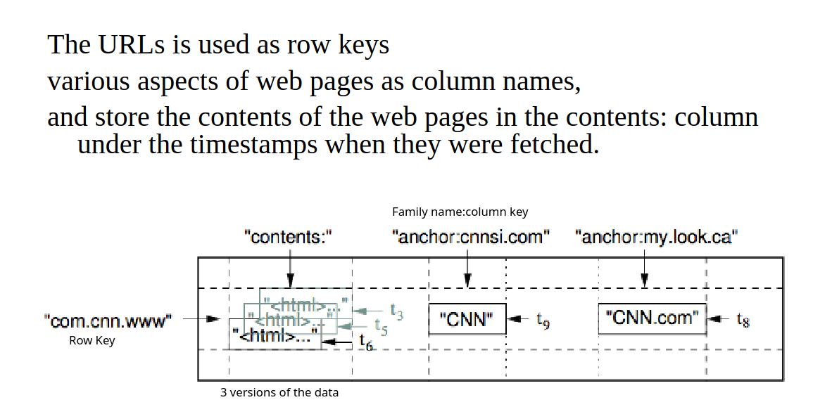 In the example, why do we use the reversed URL as the row key? Because in this way we can create row ranges called tablets, which are the units of distribution and load balancing. As a result, reads of short row ranges are efficient and typically require communication with a small number of machines. Reversing the URL we group into contiguous rows pages of the same domain.