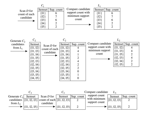 - Prune step: Remove candidates from C_k that have any (k-1)-subset not in L_{k-1}.